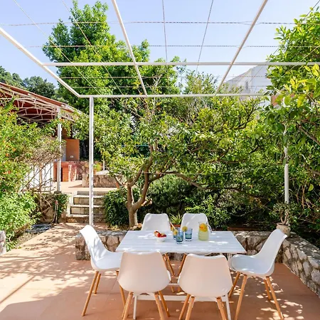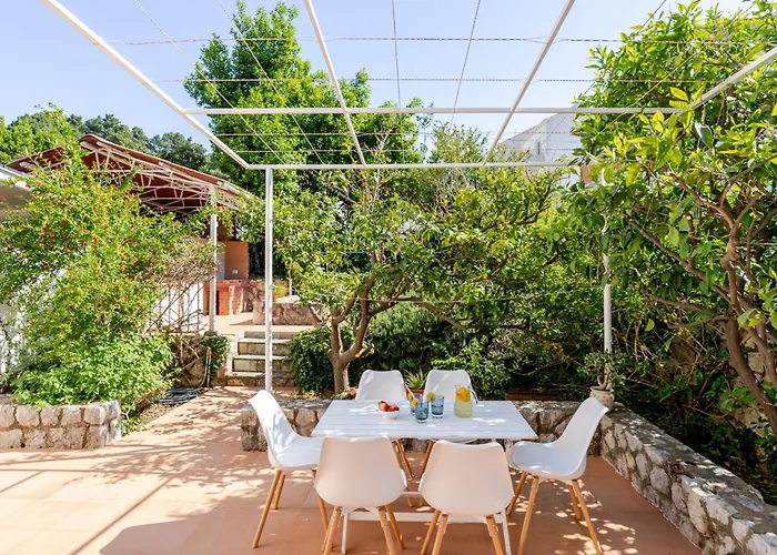Von einer Terrasse dieser Villa in Dubrovnik aus können Gäste einen Ausblick auf den Garten genießen. Zur Ausstattung des Badezimmers gehören auch eine getrennte Toilette und eine Dusche. Badezimmer sind auch mit einem Haartrockner, Toilettenartikeln und Badelaken für Ihren Komfort ausgestattet.